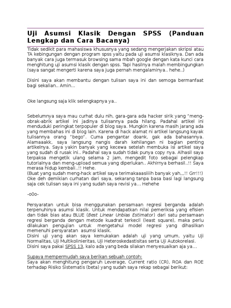 Uji Asumsi Klasik Dengan SPSS Panduan Lengkap Dan Cara Sumber : id.scribd.com